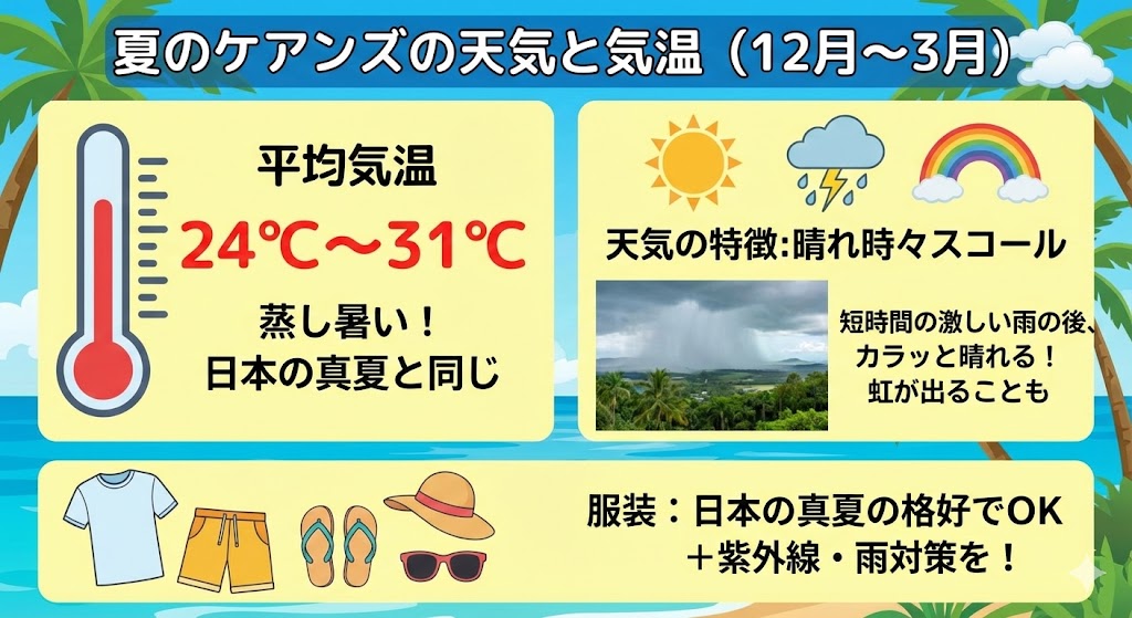 まずは、夏のケアンズのリアルな気候と、あえてこの時期を選ぶメリットについてお話しします。