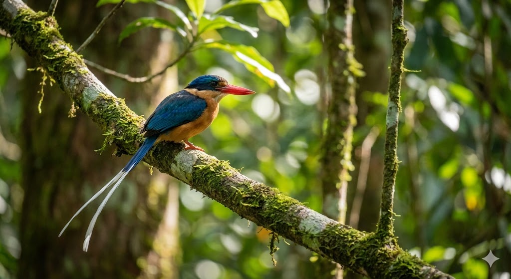 雨季(夏)にニューギニアから渡ってくる、尾羽がラケット状になった非常に美しいカワセミ。