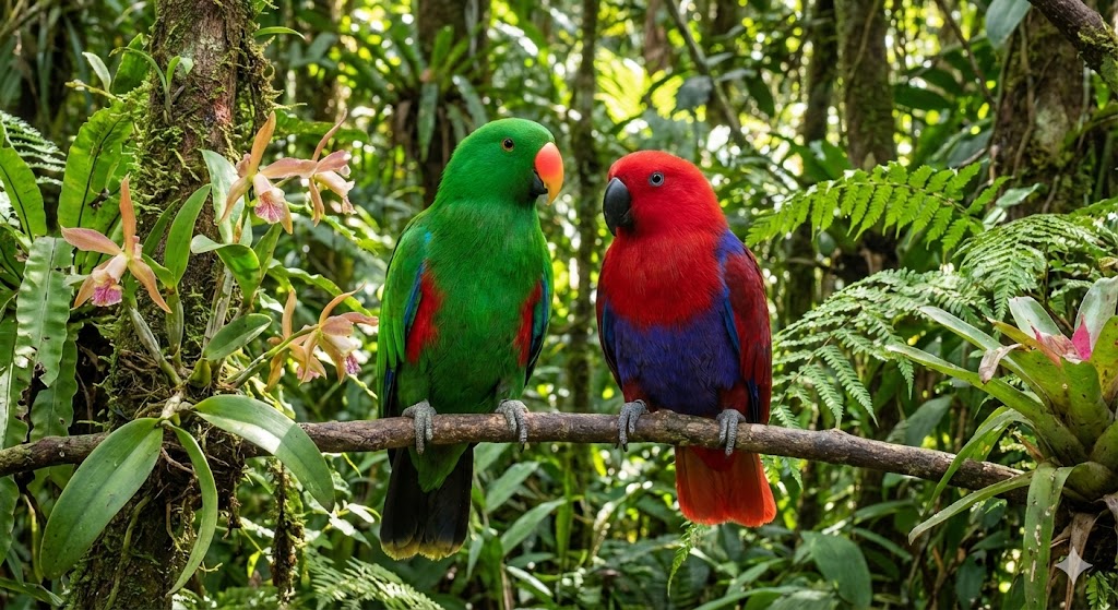 オスは鮮やかな緑色、メスは深い赤と青という、雌雄で全く色が違う美しいオウム。