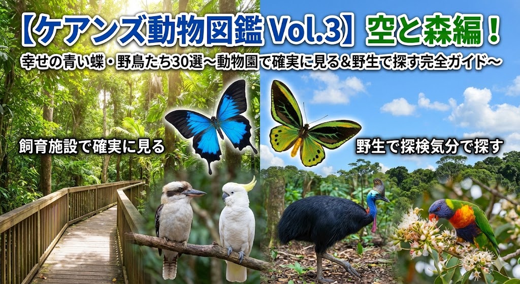 ケアンズの動物たちを紹介するシリーズ、[Vol.1 陸上編](動物編)、[Vol.2 海編](ウミガメ・ニモ)に続き、第3弾はいよいよ【空と森の生き物】がテーマです。
