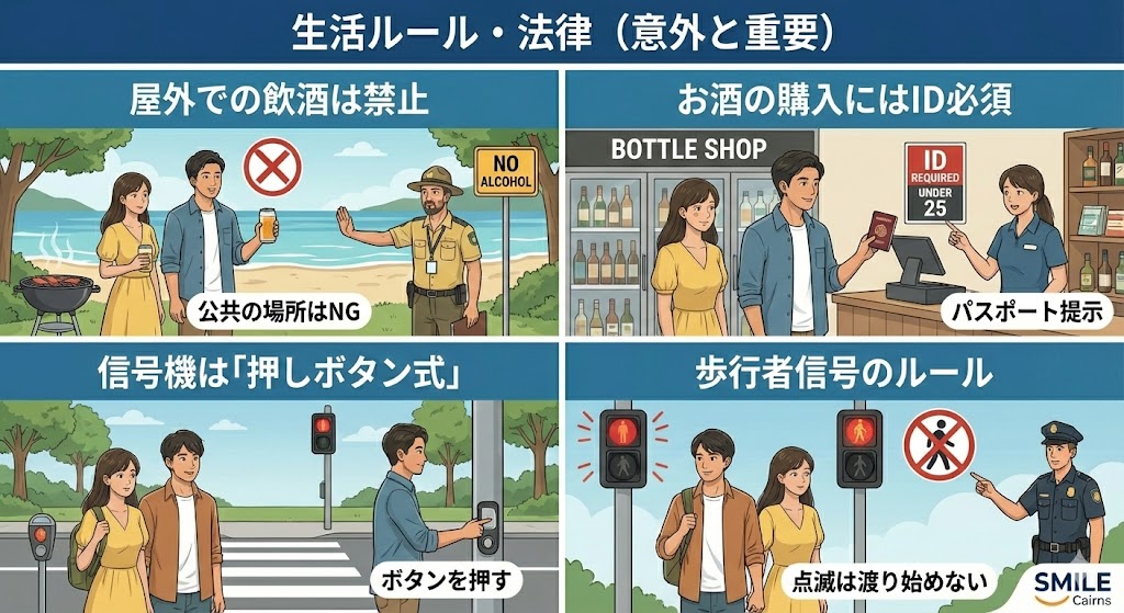 👉 対策: 赤信号での横断(Jaywalking)は罰金の対象になるので、必ず信号を守りましょう。