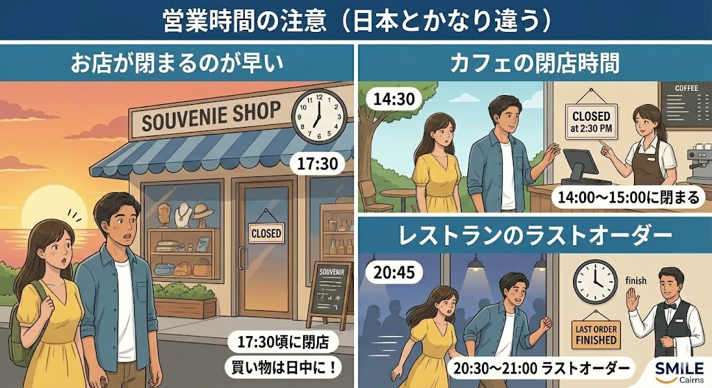カフェは13:00〜15:00、アパレルショップやショッピングセンターは17:30頃に閉まることがほとんど。