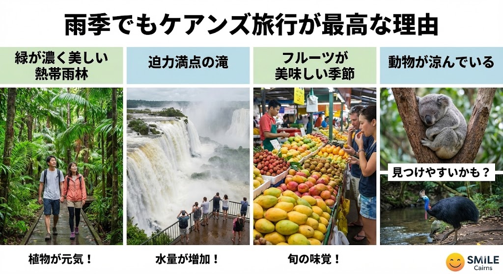 「雨だと遊べない?」と心配になる方もいるかもしれませんが、対策さえ知っていれば、むしろ緑がいきいきとした美しいケアンズを楽しめます!