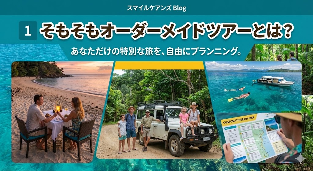 | 1 そもそもオーダーメイドツアーとは? 1-1 一般的なパッケージツアーとの違い 1-2 なぜスマイルケアンズはオーダーメイドに強いのか 2 スマイルケアンズのオーダーメイドツアーでできること 2-1 行き先・ルートを自由に決められる 2-2 写真を最優先にしたスケジュール設計 2-3 ドローン・星空フォトも組み込み可能 3 こんな方にオーダーメイドツアーはおすすめ 3-1 初めてのケアンズ旅行 3-2 家族旅行・子連れ旅行 3-3 英語が不安な方 4 実際のオーダーメイドツアー例 4-1 モデルケース①|家族旅行(小さなお子様・ご両親あり) 4-2 モデルケース②|ハネムーン・最高の思い出作りプラン 4-3 モデルケース③|アクティブ派!ケアンズ制覇プラン 5 料金は高い?オーダーメイド=高額ではありません 5-1 なぜ意外と高くならないのか 5-2 グループ旅行なら「割り勘」でお得! 6 オーダーメイドツアーの相談から当日までの流れ 6-1 STEP1:日本語で無料相談 6-2 STEP2:ヒアリング・ご提案 6-3 STEP3:内容確定・当日 7 よくある質問(FAQ) 8 ツアーに自分を合わせない旅を |