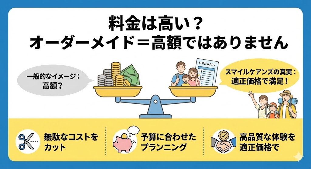 一般的なパッケージツアーと、スマイルケアンズのオーダーメイドツアーを比較すると、その自由度の差は圧倒的です。