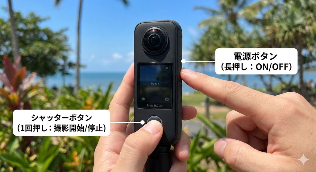 ①Insta360 X4カメラの電源を入れます。