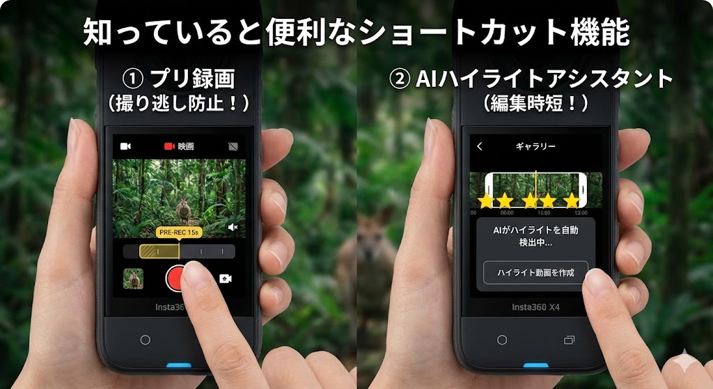 360度動画は、後から好きな方向(アングル)に向けられるのが特徴ですが、全部自分で編集するのは大変ですよね。 そこでおすすめなのが、AIが勝手に良いシーンを選んで編集してくれる機能です。これが本当にすごいです!