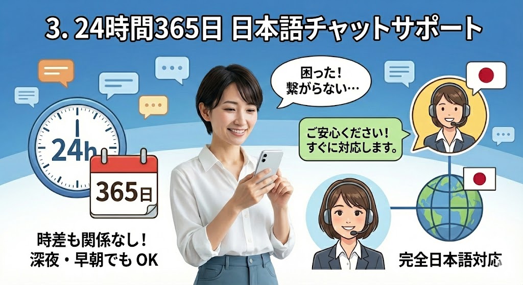 3. 24時間365日 日本語チャットサポート